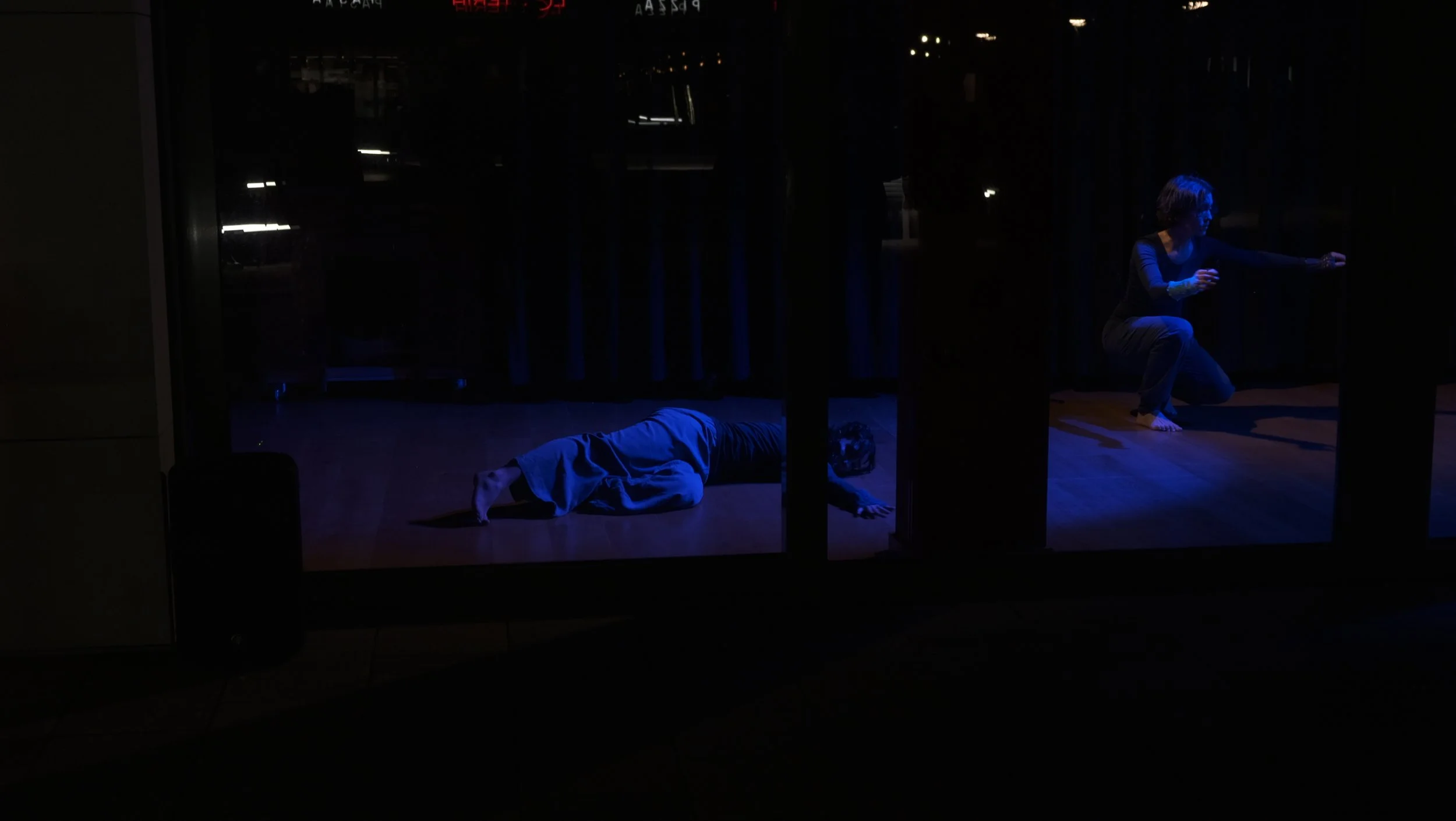 Wie ein Fisch im Wasser tanzt jemand im Bühnenraum, dort wo normalerweise Zuschauer sitzen. Und wir schauen von draußen zu. Die Performance ist eine Einladung zu sehen und gesehen zu werden. Den Tanz zu inspirieren und selbst beeinflusst zu werden.